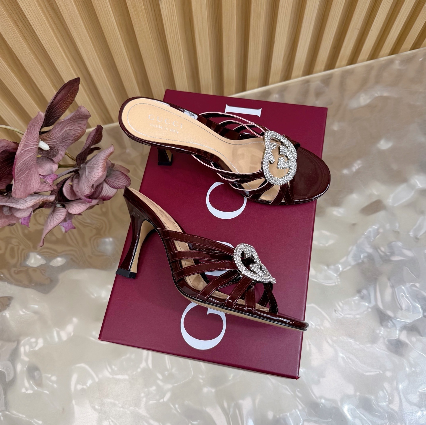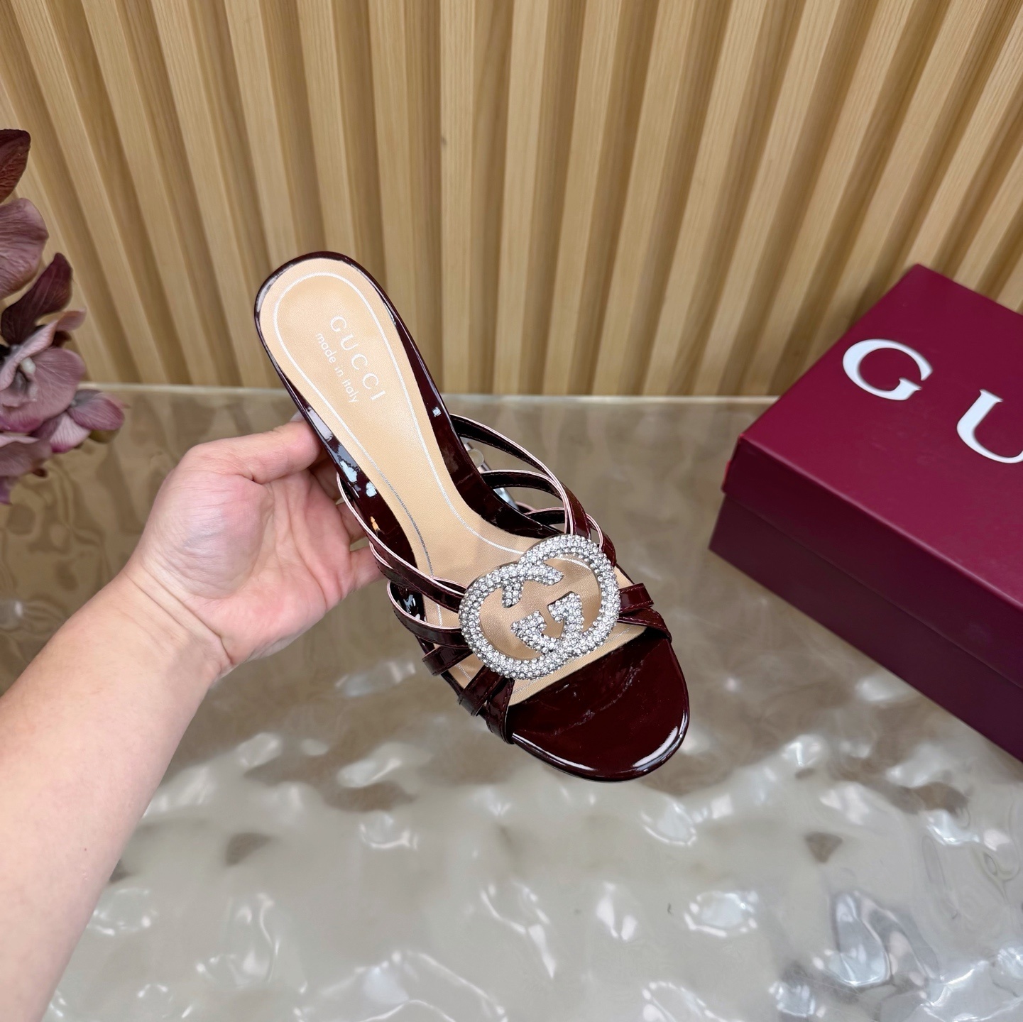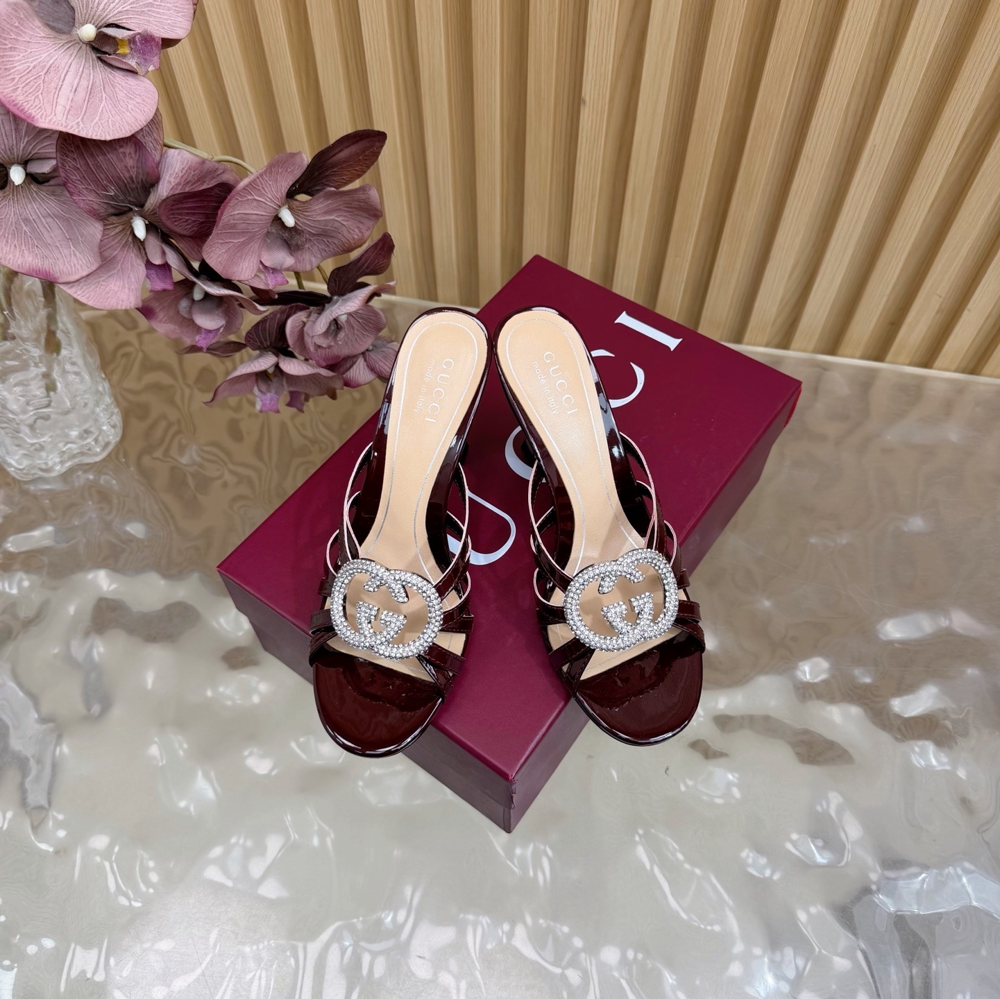 crystal Gucci Burgundy Patent Leather Mules - Gucci Burgundy Patent
