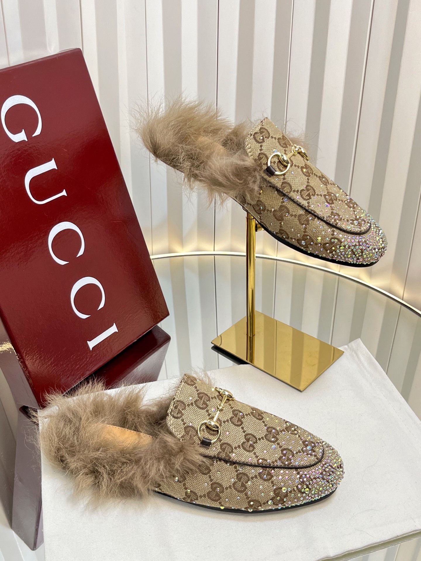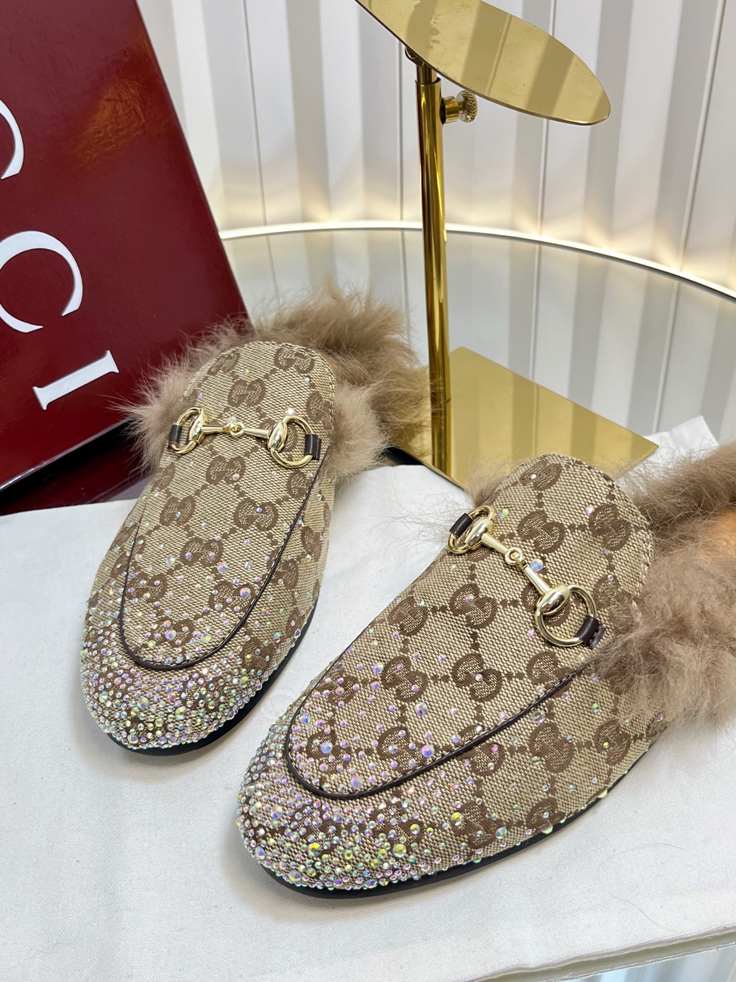 Gucci Beige GG Rhinestone Slippers - Fur Trim