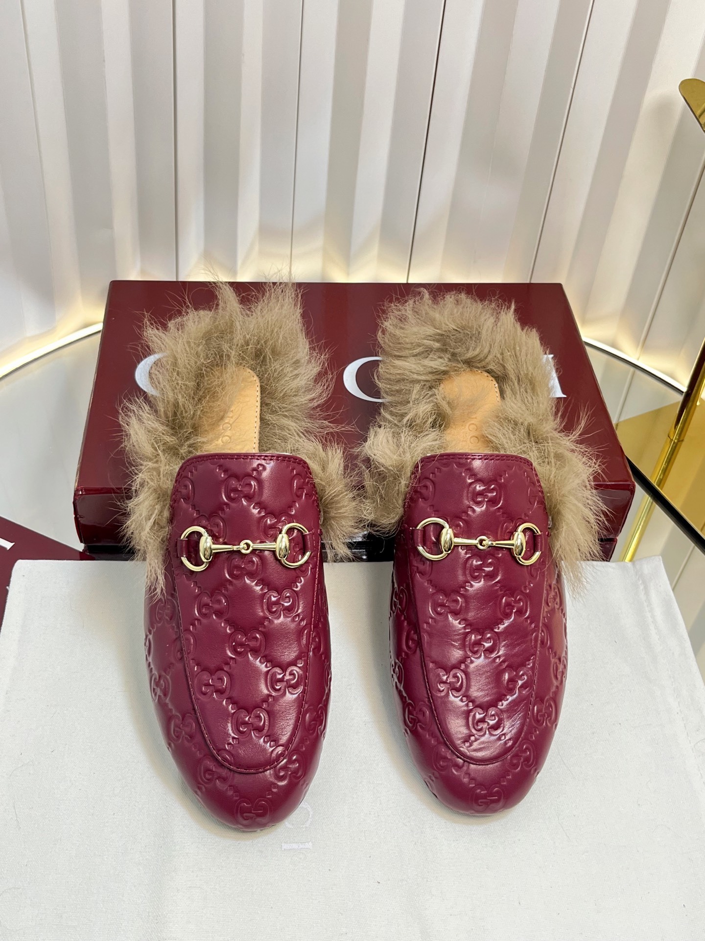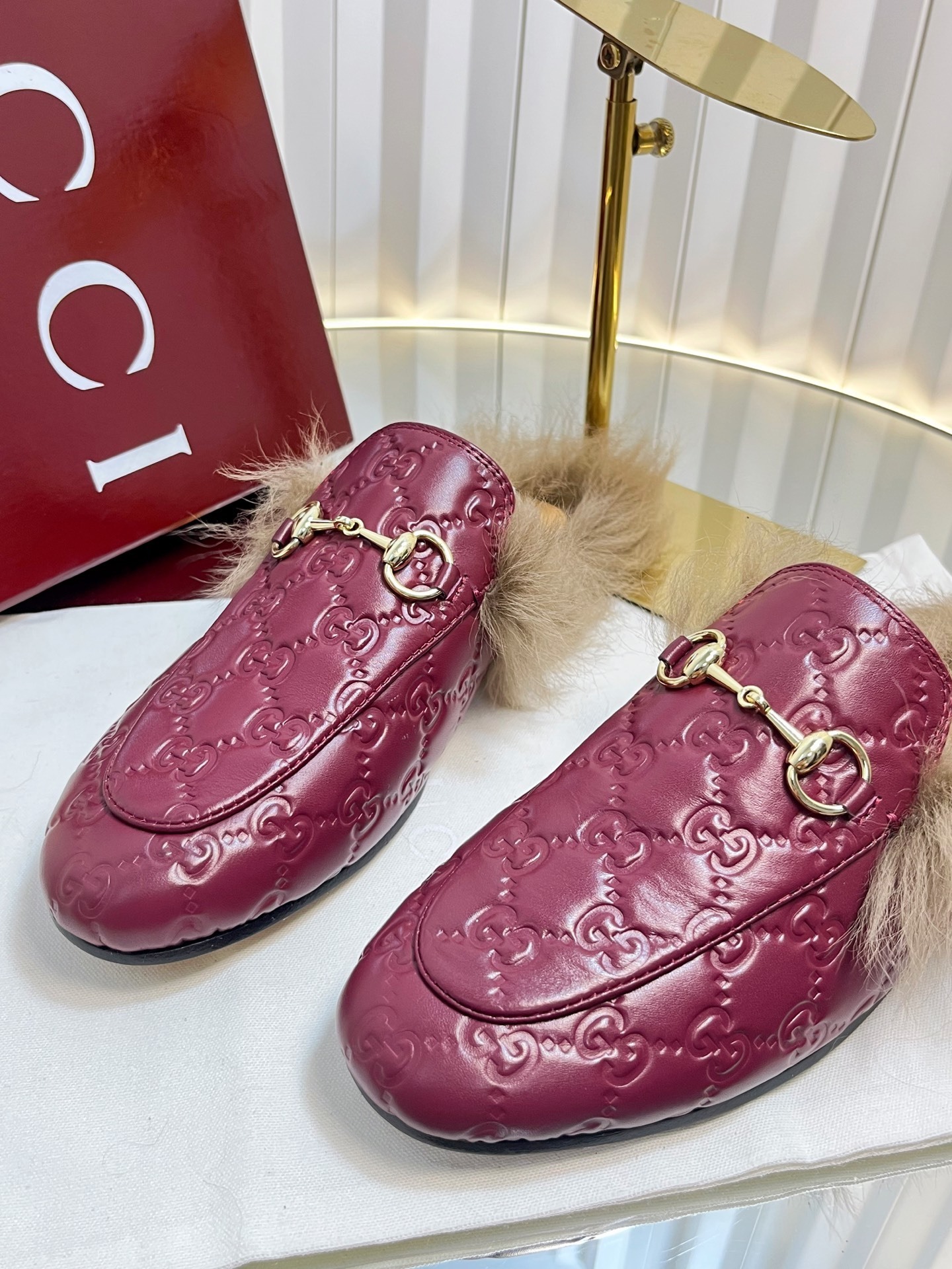 Gucci Burgundy Fur Loafers - Gucci Burgundy Embossed Fur-Lined Loafers