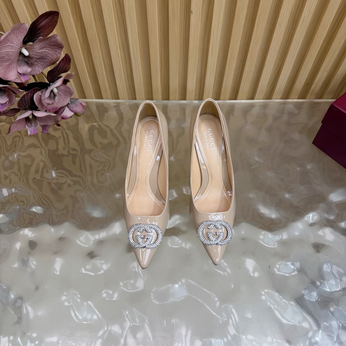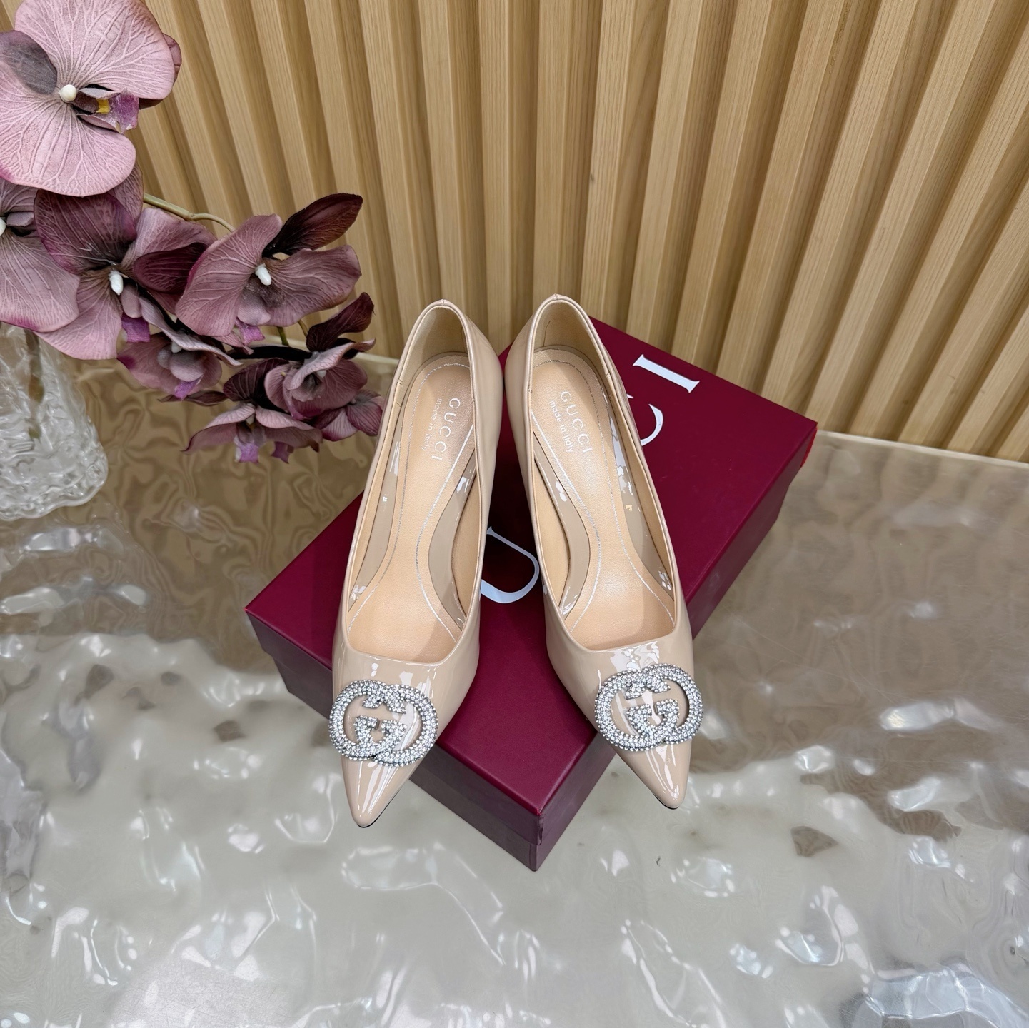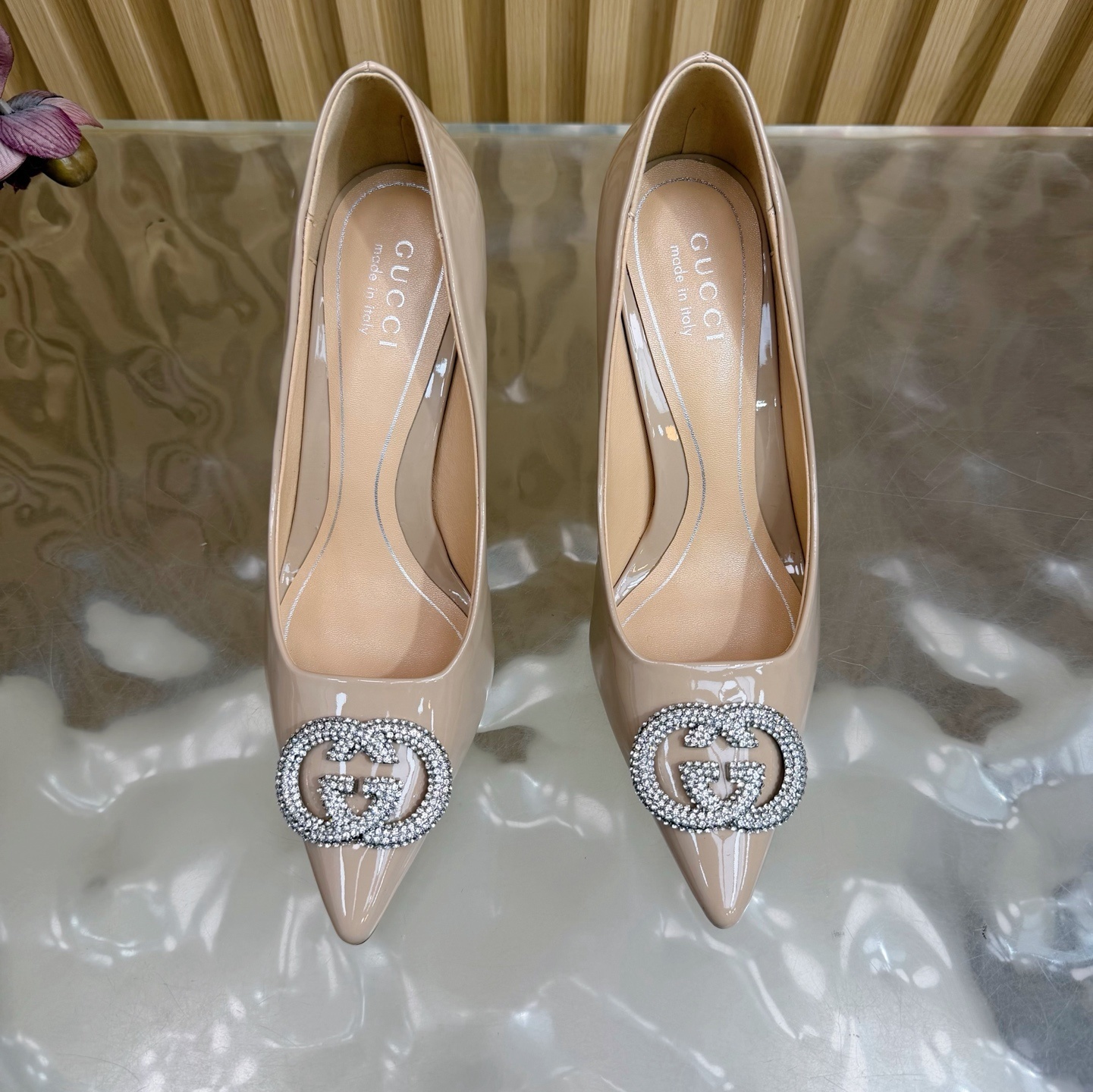 Gucci Nude Patent Leather Pumps - Crystal GG Accent