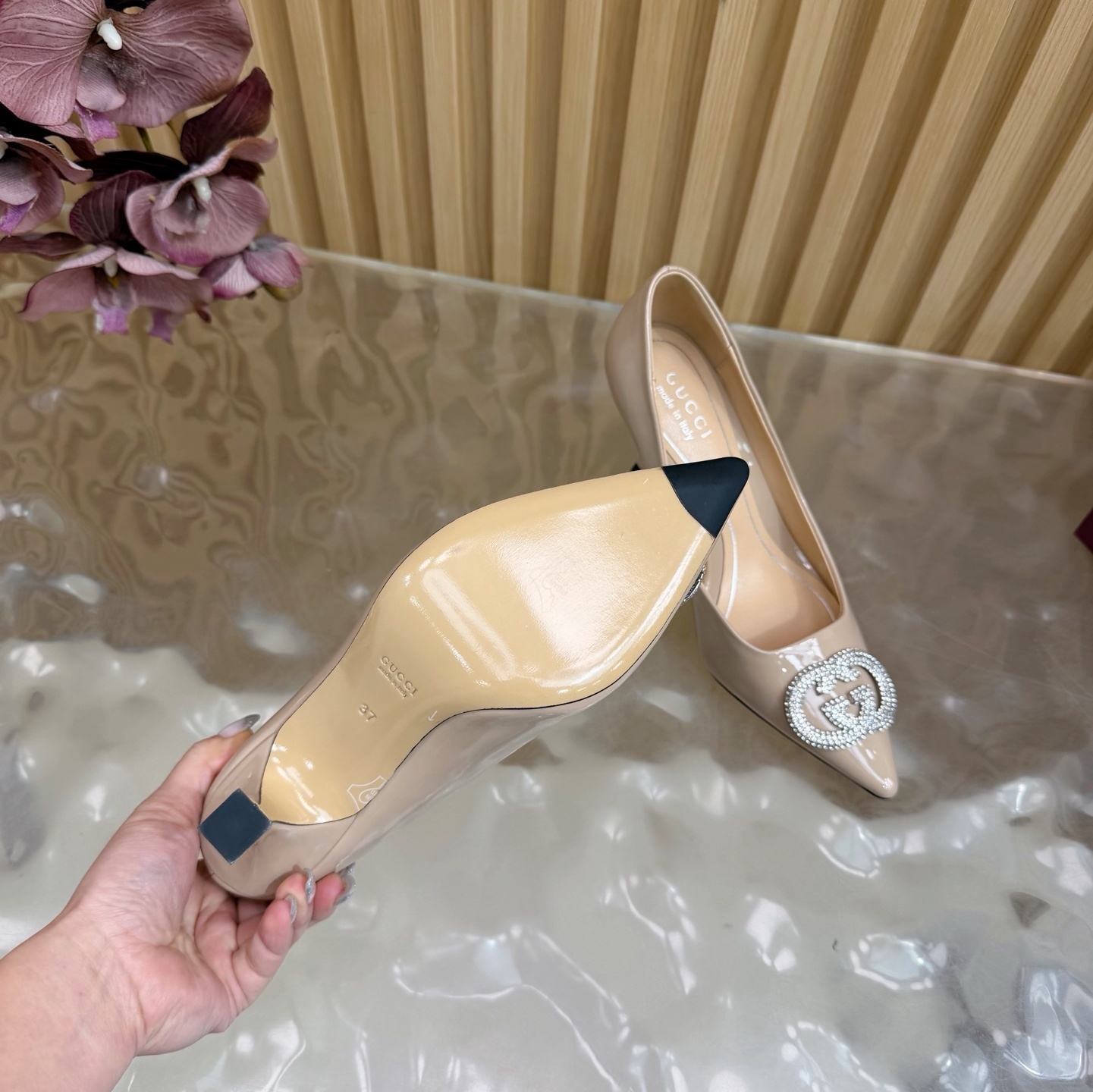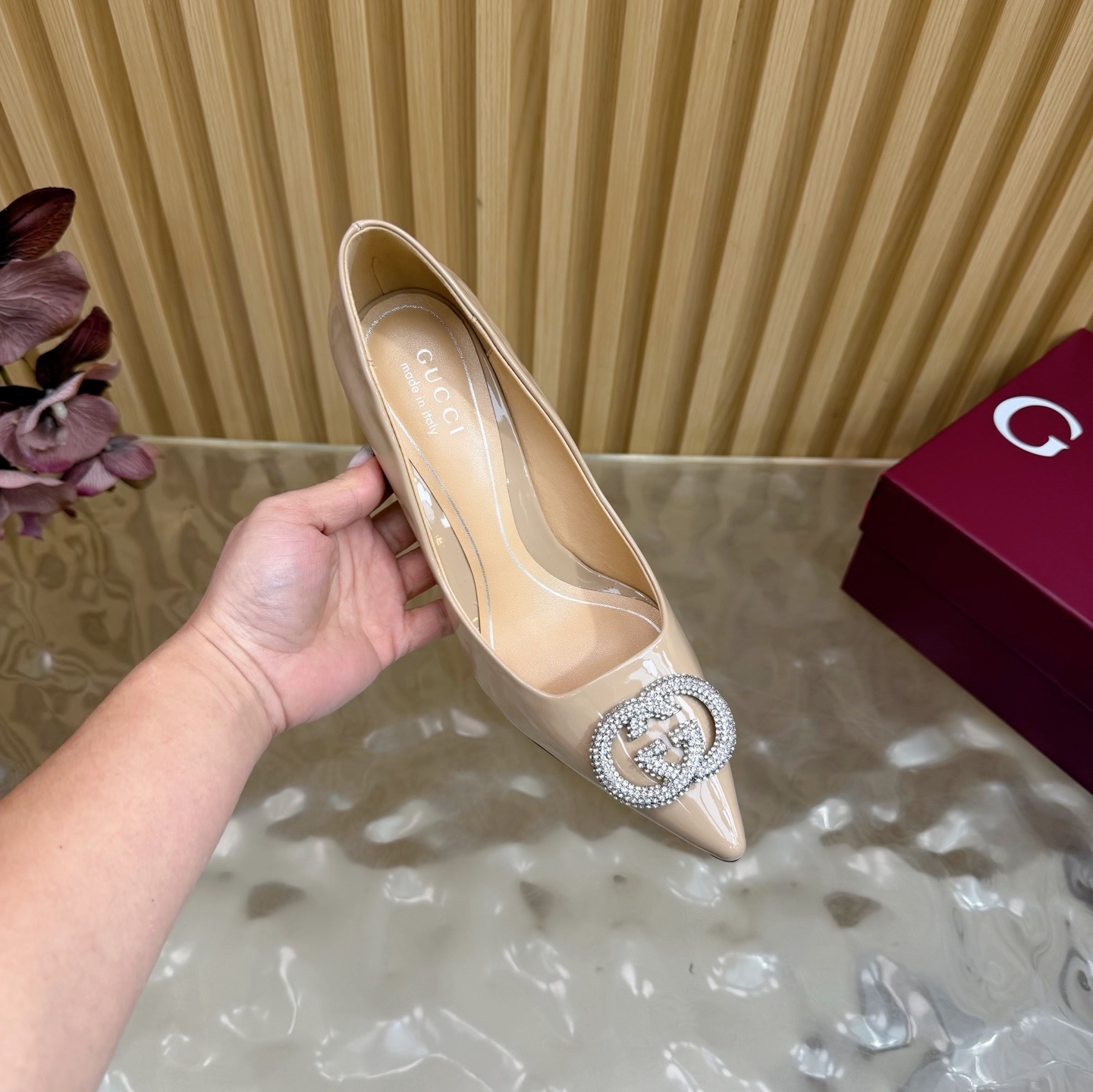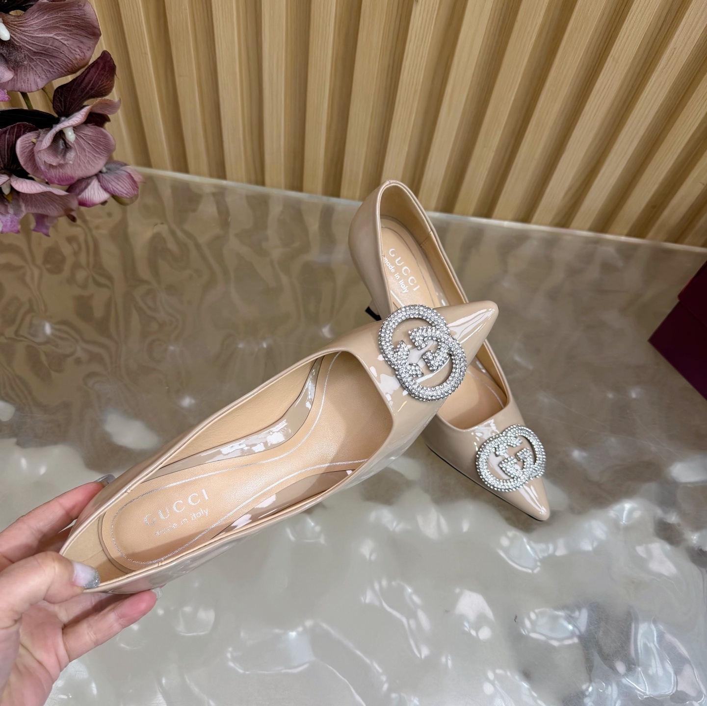 Gucci Nude Patent Leather Pumps - Crystal GG Accent