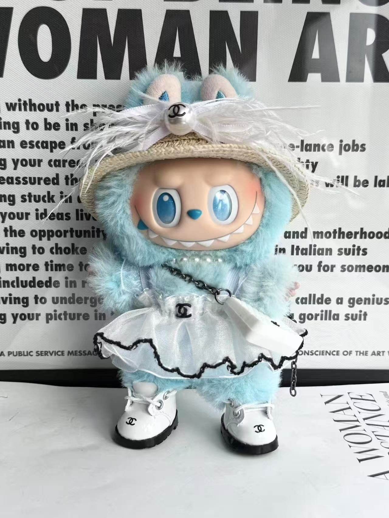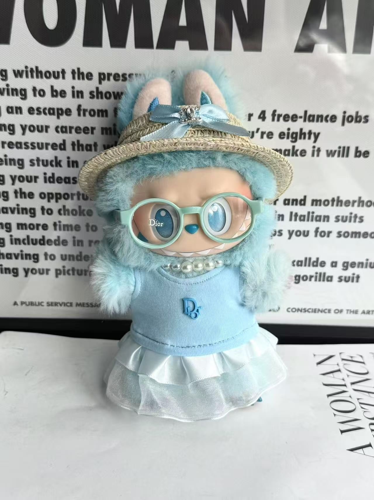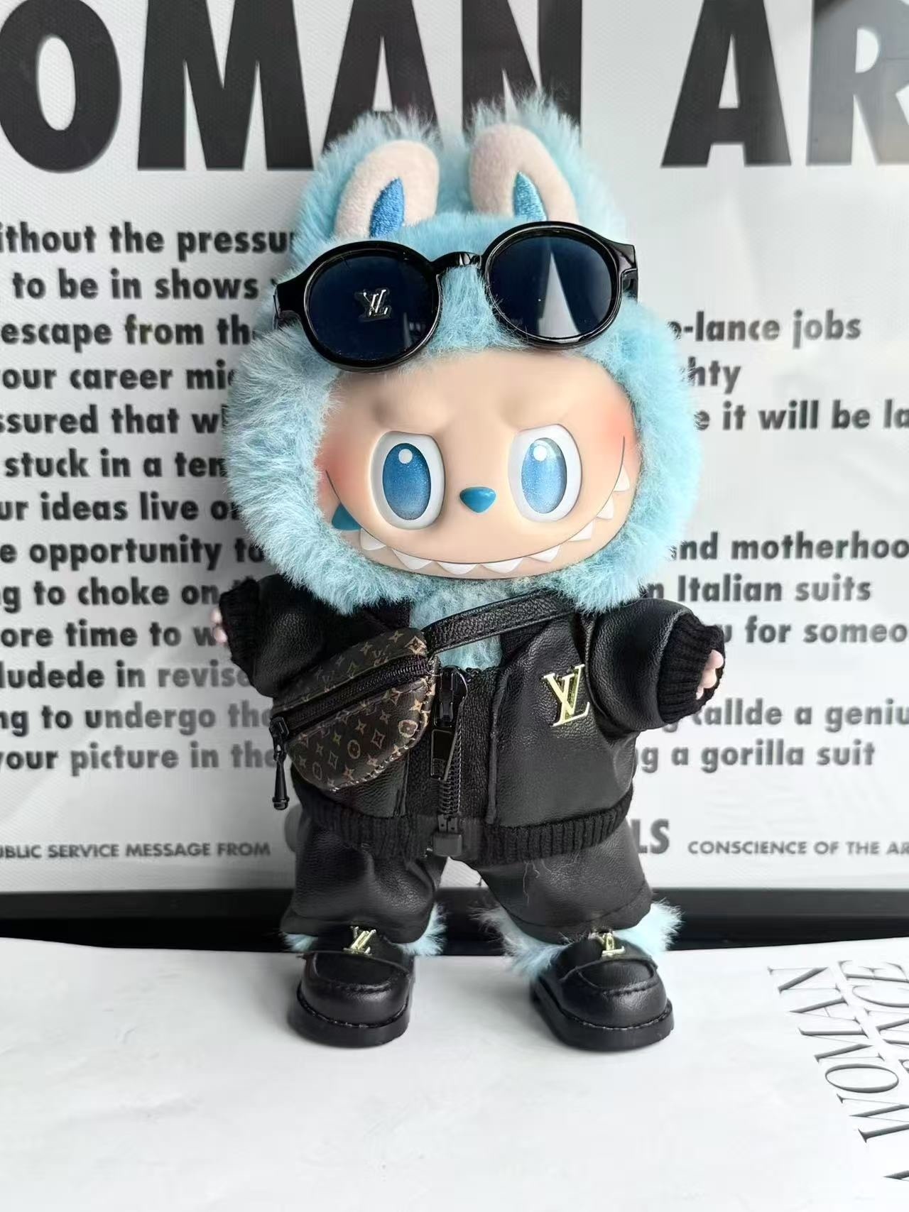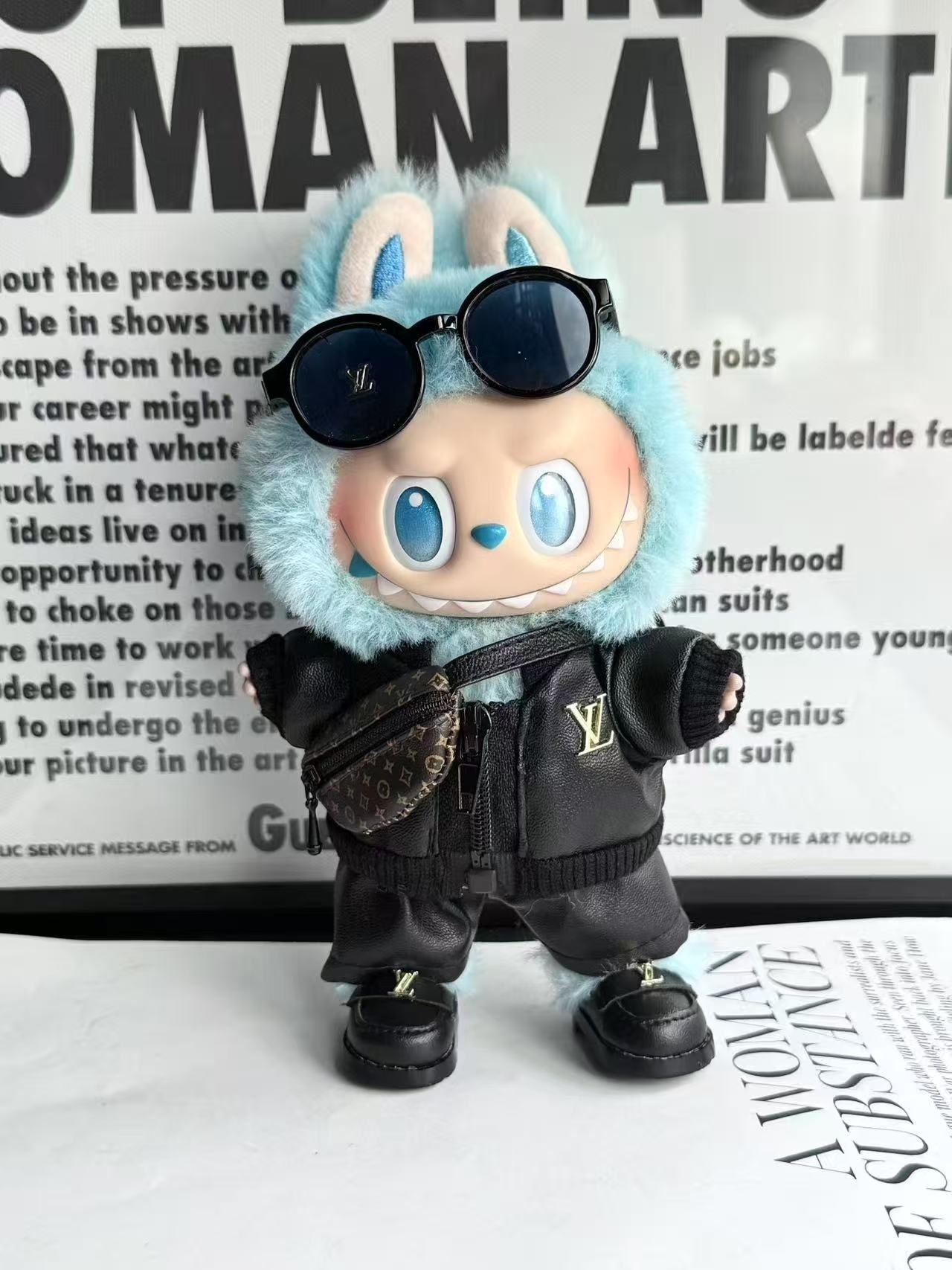 The design of this Labubu figure is truly exceptional, blending the iconic mischievous charm of Labubu with an adorable, stylish pink rabbit persona. The character's signature wide, expressive eyes and toothy grin are perfectly complemented by the soft, fluffy pink rabbit ears and matching hood. Adorned with fashionable pink-rimmed glasses, a delicate string of pearls, and a sparkling heart emblem on its sweater, this figure exudes a playful yet chic aesthetic. The ensemble is completed with a layered white tutu skirt, adding a touch of balletic grace, and miniature pink sneakers that give it a contemporary, street-style edge. This unique combination of cute, edgy, and elegant elements makes the Labubu Pink Rabbit Collectible a standout piece. Its vibrant pink hue, available also in a cool blue, makes it a versatile decorative item that can brighten any space and spark conversations among art enthusiasts and toy collectors alike. Explore more unique designs in our exclusive art toy collections and find your next treasured piece.