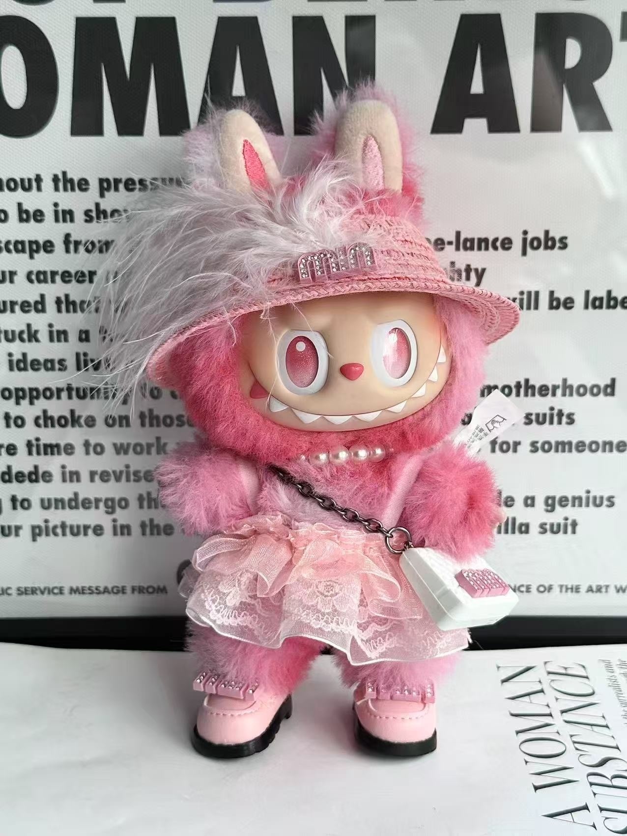 Our Labubu Pink Rabbit Collectible Art Toy is a testament to superior craftsmanship and material excellence. Each figure is meticulously constructed using a combination of durable PVC and ABS plastics for the core body and intricate facial features, ensuring a robust and long-lasting structure. The plush elements, such as the fuzzy rabbit hood, are made from high-quality, soft-touch fabric, providing a delightful tactile experience and adding to its luxurious appeal. The miniature clothing, including the finely knitted sweater and the delicate tulle skirt, is crafted from premium textiles, designed to maintain its shape and vibrant color over time. The pearl necklace and miniature glasses are carefully integrated, highlighting the attention to detail that sets this collectible apart. We adhere to stringent quality control standards, ensuring that every Labubu figure you receive is free from imperfections and ready to be admired as a true work of art. This commitment to quality guarantees a valuable addition to your collection.